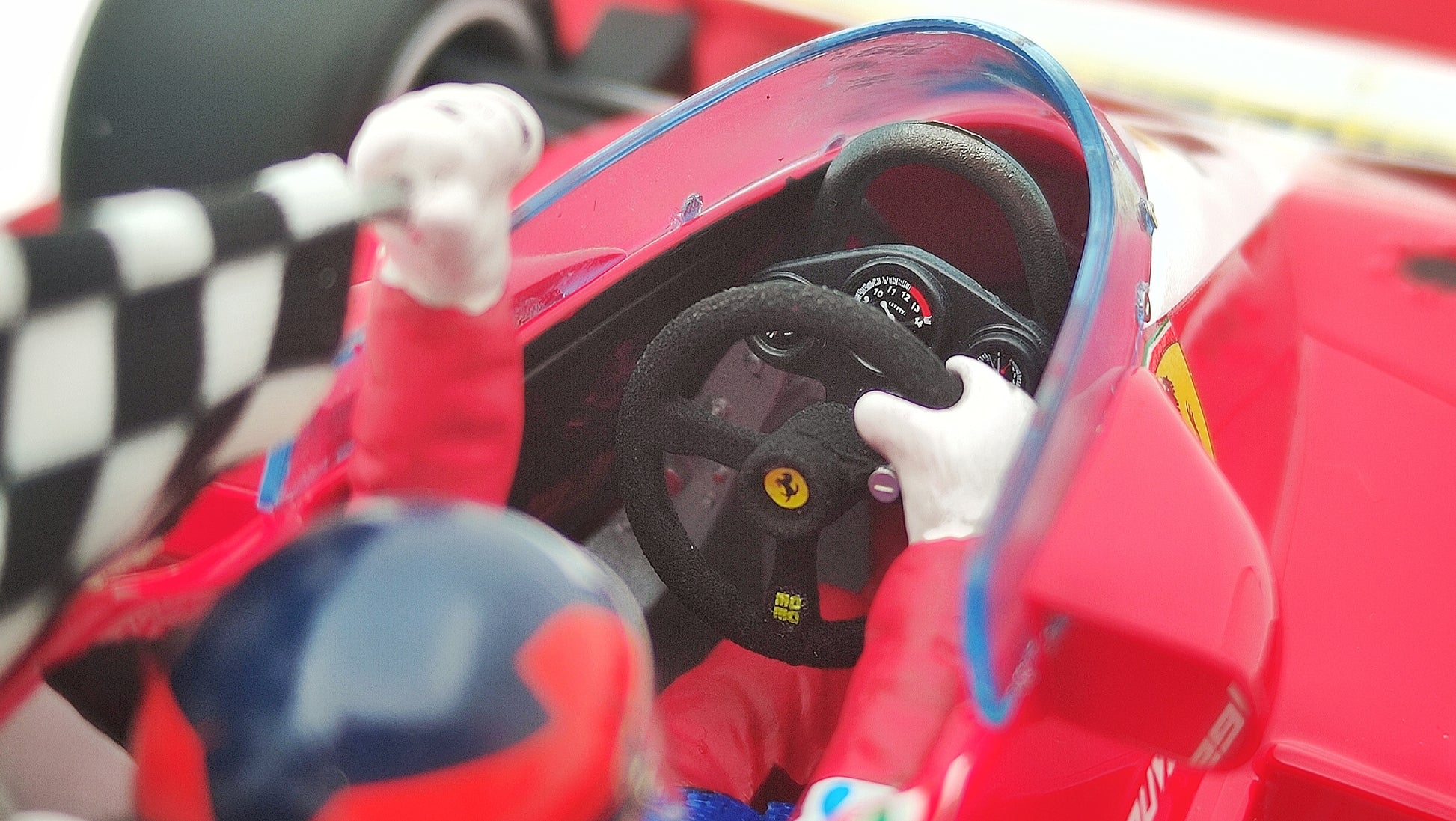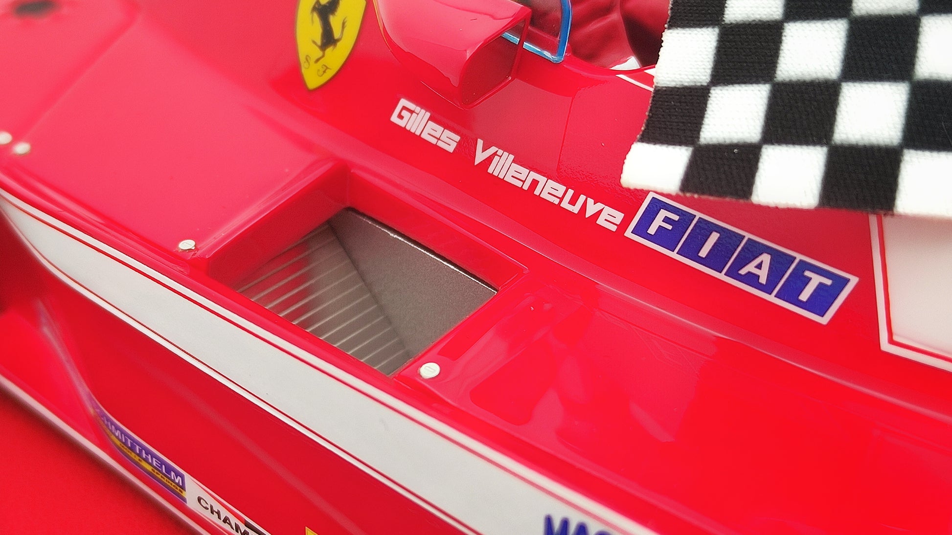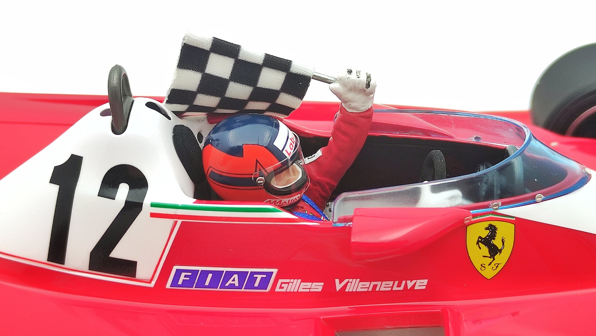 Special Gilles Villeneuve Collection packaging. Limited Edition to 500 pcs. only. Includes a very high quality acrylic dust cover. With driver figurine and victory flag! Tobacco decals included.